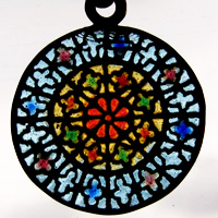 チャームを空(光)にかざすと、本物のステンドグラスの様に薔薇窓が綺麗に浮かび上がります(下写真参照)。