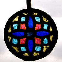 チャームを空(光)にかざすと、本物のステンドグラスの様に薔薇窓が綺麗に浮かび上がります(下写真参照)。