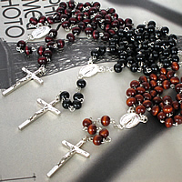 奇跡のメダイ教会で見つけた、ウッド調のビーズを使用したロザリオネックレス(短め/頭囲59〜60cm以内)です。