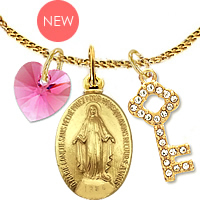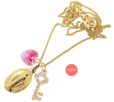 不思議のメダイのゴールド/メタリック仕上(ch-35)のメダイに、「スワロフスキー(ローズピンクハート)ペンダント」、「カットガラスを埋め込んだカギモチーフのチャーム」、「ゴールドチェーン(45cm)」をセットにした、当サイトオリジナルのネックレスセットです。