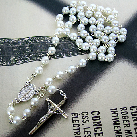 パリの教会で見つけた、ホワイトパール調のビーズが印象的なロザリオネックレス(頭囲63cm以内)です。