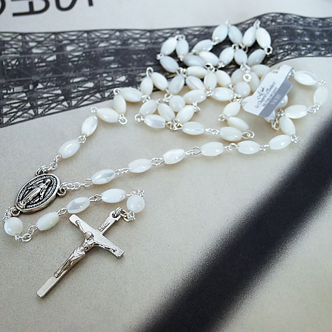 奇跡のメダイ教会で見つけた、マザーオブパール製ビーズを使用して製作されたロザリオネックレス(長め/チェーン部分74cm)です。シルバー製のコーティングが施されています。