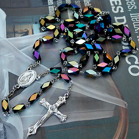パリの教会で見つけた、カット面が光の角度によってオーロラのように虹色に輝くビーズを使用して製作されたロザリオネックレス(長め/チェーン部分/約81cm)です。