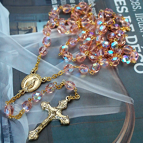 パリの教会で見つけた、可愛いクリスタルピンクのビーズと、ゴールドパーツ(ITARY製)との組合わせが素敵なロザリオネックレス(長め/チェーン部分/約75cm)です。