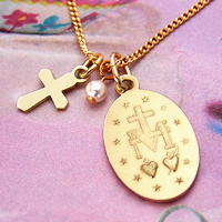 フランスのパリで入手した「奇跡のメダイ(不思議のメダイ)/ch-35」に、「プチクロスパーツ」と「スワロフスキー/クリスタルパールビーズ」、そして「チェーン(45cm)」をセットにした当店オリジナルのネックレスです。