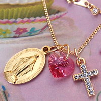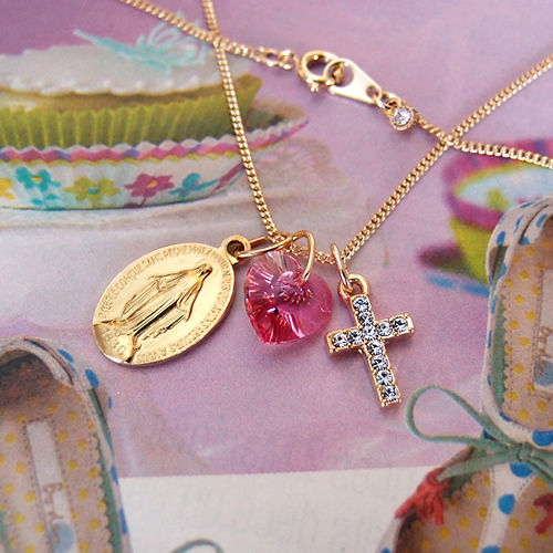 パリの奇跡のメダイ教会の「不思議のメダイ」のゴールド(ch-35)に、スワロフスキーのハートチャームとカットガラスを埋め込んだビジュークロス、チェーン(45cm)をセットにしたネックレスです。