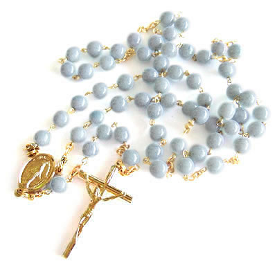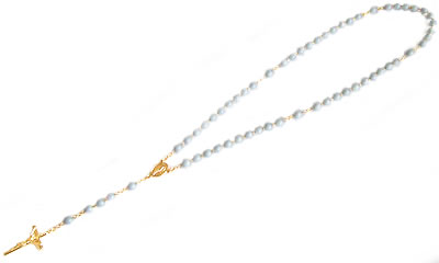 パリの教会で見つけたブルービーズのロザリオです。ロザリオは、祈りの回数を数えるための道具ですが、アクセサリーとして身につけてもステキです。長さがあるので、ネックレスとして身につけることが出来ます。連結部分は不思議のメダイのデザインです。