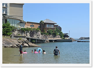旅館のプライベートビーチで遊ぶ家族達。