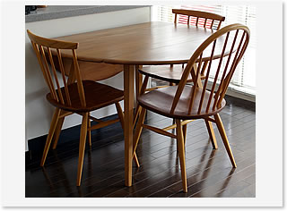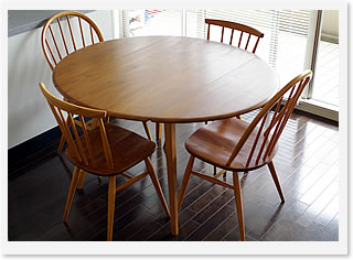 さて、 どんなテーブルにしようかと迷いに迷った数週間。。。イギリスErcol社のアンティークテーブルが我が家の一員になりました。チェアもオソロでErcol社。 全体的に丸みのあるデザイン、温かみのある色目が気に入っています。1950年代のモノとのことで、チェアの座面もいい感じに磨り減り、長い時間座っていてもオシリが痛くなりません。テーブルの板は、量サイドがたためるようになっていて、普段は(下画像の様に)片方だけたたんで使っています。リビングが狭いのでスッキリして嬉しいです。これから大事に大事に使って、味のあるテーブル&