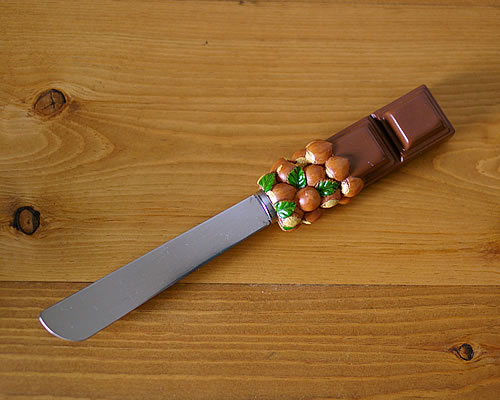 フランスの生活雑貨店で見つけた、柄の部分がアーモンドチョコレートモチーフになっているバターナイフです。