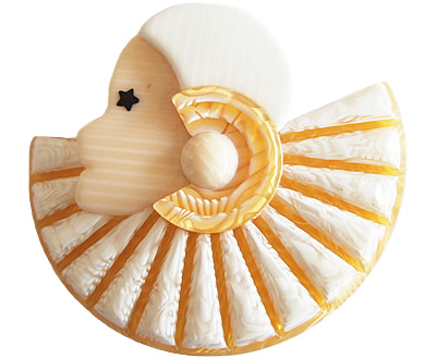 目が★になっているピエロのブローチです。帽子、イヤリング、襟はホワイトカラーに統一されいますが、イエロースケルトンのセルロイドがサンドしてある事で、とても上品なデザインになっています。襟元のカットが繊細でステキです。