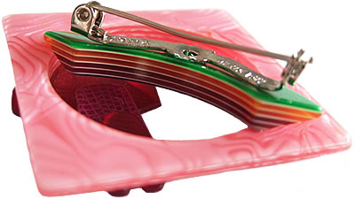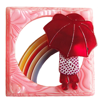 Lea Stein(1968〜80s)ヴィンテージブローチです。この年代に作られている作品の特徴は、セルロイドを何層も張り合わせた細かい作りになっています。多くの作品の中でも、人気の高い「Rainbow & Umbrella」は、レア!左下画像の様に虹の層が、6枚のセルロイドの間にホワイトの薄いセルロイドがサンドされたミルフィーユになっています。芸の細かさにうっとりしてしまうブローチです。