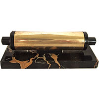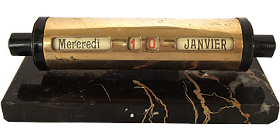 重厚感のあるフランスのアンティーク万年カレンダーです。土台の部分はおそらく黒大理石が使用されていると思われます。左右の黒いつまみを回すことで日付等を変更する事が出来ます。