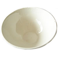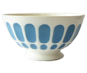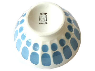 DIGOINのカフェオレボウル(カフェオレボール)です。小ぶりで可愛らしく、爽やかなブルーの模様がポイント。ボールのふち2箇所カケがあり、右下段の写真の様に、釉薬を重ねて塗ったような跡があります。