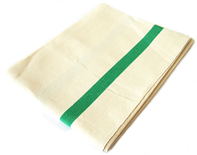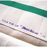 蚤の市で見つけたグリーンラインのアンティーククロスです。「TOILE PUR LIN Fleur bleue」の品質マークが入っています。