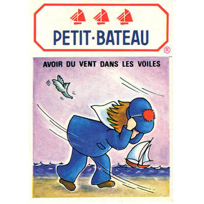 人気のプチバトーシリーズの中でも、レアな古いステッカーです。少年や鳥が風に奮闘する姿が、コミカルに描かれています。シミなどなくキレイなペーパーバッグです。