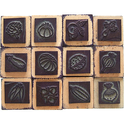 蚤の市で見つけたアンティークスタンプセットです。いろんな野菜のプチスタンプ12個をセットにしてお届けします。