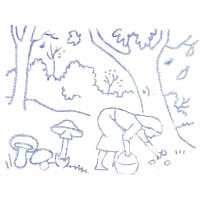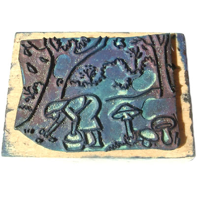 蚤の市で見つけたアンティークスタンプです。おばあさんが、キノコ採りをしている風景の絵のようです。キノコも美味しそうに見えます♪