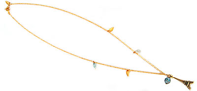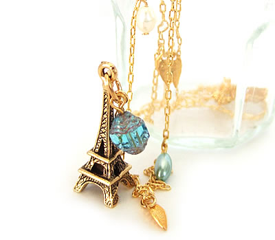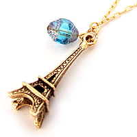 フランスのとってもきれいなブルーのアンティークビーズが付いたエッフェル塔チャームのネックレスです。チェーンの部分にもたくさんビーズがついていて、とってもキュート!