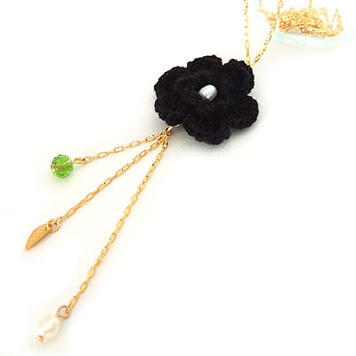 毛糸のお花がポイントのキュートなネックレスです。お花の先からは3本のアンティークビーズがついています。モコモコしたお花がカワイイですね♪