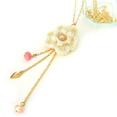 毛糸のお花がポイントのキュートなネックレスです。お花の先からは3本のアンティークビーズがついています。モコモコしたお花がカワイイですね♪