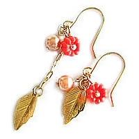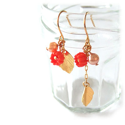 赤いお花と葉っぱの付いたキュートなピアスです。右左長さの違うデザインがポイント。同デザインのネックレスと一緒に身につけるとステキです。