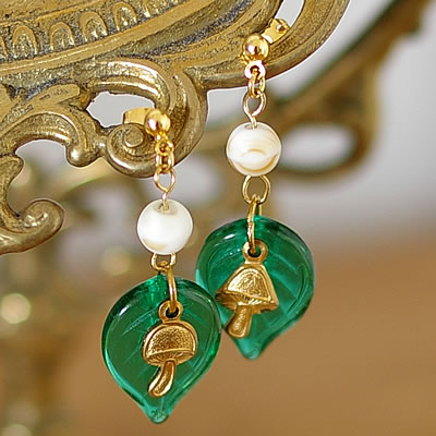 グリーンリーフのビーズと、キノコのチャームとの組み合わせがとっても秋らしくキュートな“mignon”のピアスです。