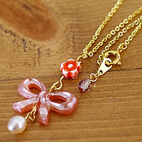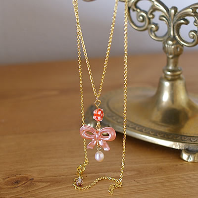 マーブルピンクのリボンがとっても可愛い“mignon”のネックレスです。先端の淡水パールも素敵です♪