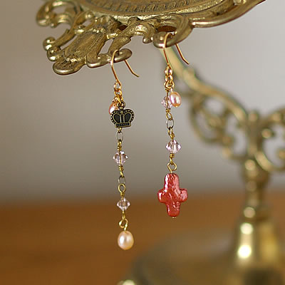 クロスの形状をしたピンク淡水パールと王冠のチャームがとっても可愛い“mignon”のピアスです。