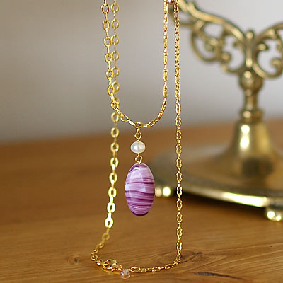 マーブル柄のボリュームあるフランスビーズがとっても素敵な“mignon”のネックレスです。チェーンは左右で異なるタイプを連結しています。