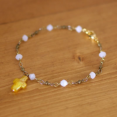 クロスの形状をしたイエロー淡水パールがとっても可愛い“mignon”のブレスレットです。ストックは2点あり、淡水パールの質感が若干異なります(右下の写真をご参照ください)。