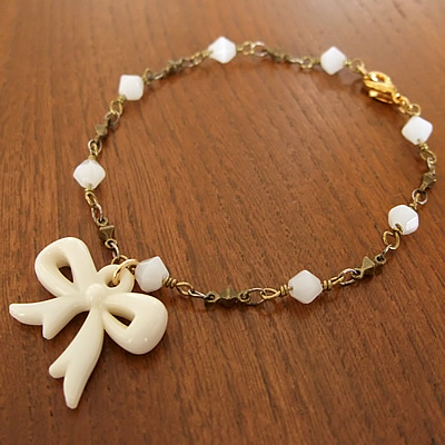 リボンのチャームと、ホワイトビーズとの組み合わせがとっても可愛い“mignon”のブレスレットです。