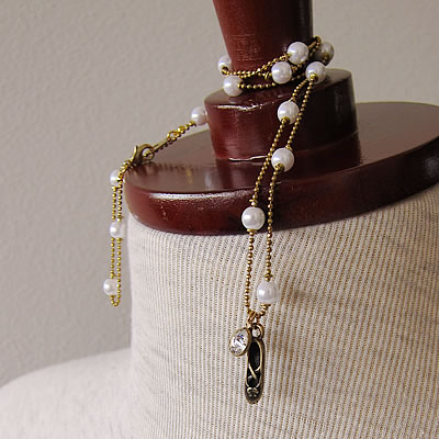 バレーシューズと綺麗なストーンがチャームになった“mignon”のパールチェーンネックレスです。同タイプのチェーンを使った“mignon”のピアスもあります。