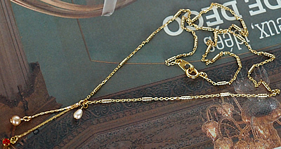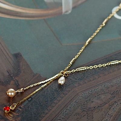 小さなカットガラスのチャームとパール調ビーズ、連結部には淡水パールを施した、とってもかわいいmignonの新作ネックレスです。