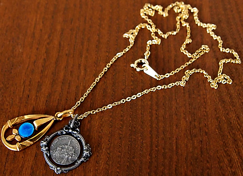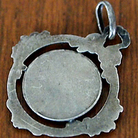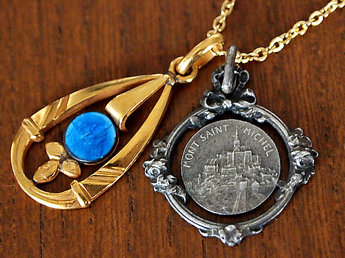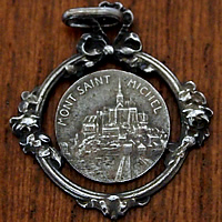 フランスの世界遺産「モンサンミッシェル」で見つけた可愛らしいラウンド型のフレームと繊細なリボンや花の彫刻が素敵なアンティークメダイです。
