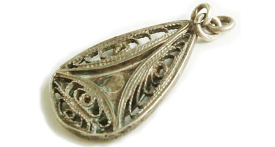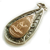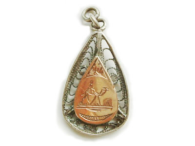魅力ある1920年代ドロップ形のアンティークチャームです。中央にあるラクダに乗った人の絵が何とも言えないカワイサ。絵のパーツは、年代を感じさせないくらい、とてもきれいなブロンズです。