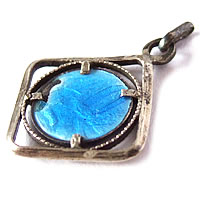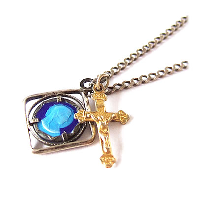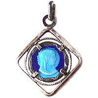 魅力ある1920年代のアンティークチャームです。スクエア枠の中にラウンドチャームが埋め込まれています。背景のブルーがマリア様の顔を引き立たせていて、魅力的です。コレクションの1つにいかがでしょうか。