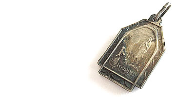 魅力あるアンティークチャームです。フレーム内のデザインや、カットがとてもキレイです。マリアさまのお顔もとても美しいですね。裏面には聖地LOURDES(ルルド)の刻印が入っています。