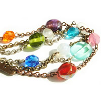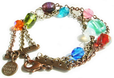 マレ界隈にあるフランスビーズアクセサリーショップ「Matiere Premiere」のオリジナルブレスレットです。アメ玉のようなキレイな大粒ビーズがたくさんついた3連ブレスレット。3色のチェーンとロゴプレートがポイント。BOX付なので、プレゼントにもオススメです。