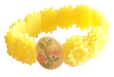とってもポップな色でキュートなN2のブレスレットです。プラスティックを使用したアクセサリーですが、すべてハンドメイドというのが驚き。お花のパーツが非常によく出来ています。センターの楕円のパーツがアクセントになっています。
