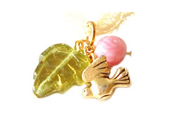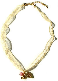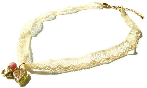 アンティークレースで作ったチャーム付きネックレスです。アンティークビーズで作ったチャームが、とってもカワイイ♪留め具部分には、葉っぱのビーズががついています。