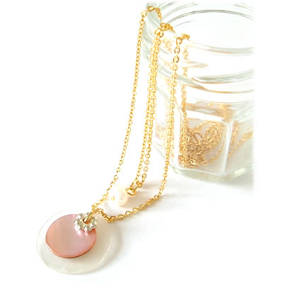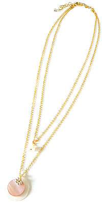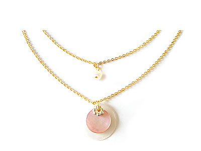 淡水パールと貝のアンティークビーズの2連ネックレスです。2枚重ねにした貝ビーズと淡水パールがエレガント。同デザインのピアスと一緒につけると素敵です。