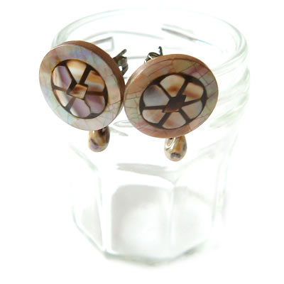 ボタンの中に貝が埋めこまれたフラワーモチーフのピアスです。下に付いたビーズがかわいらしくゆれます♪