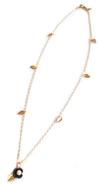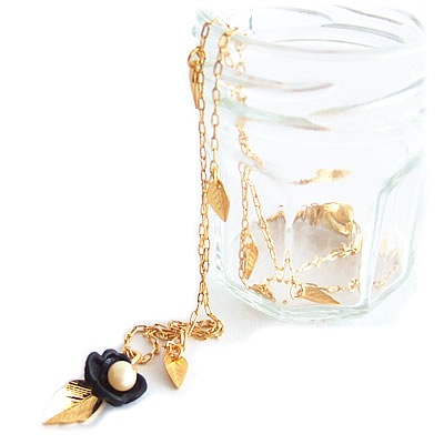 アンティークビーズを使って、お花モチーフのチャームにしたネックレスです。チェーンに葉っぱビーズがたくさんついていてとってもキュート!同デザインのピアスと一緒につけるとステキです。