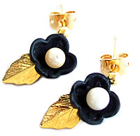 アンティークビーズを使って、お花モチーフにしたピアスです。ゴールドの葉っぱビーズがついていてとってもキュート!同デザインのネックレスと一緒につけるとステキです。
