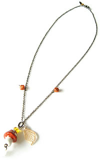 トップのキノコのアンティークビーズがポイントのかわいいネックレスです。葉っぱがたくさんついていて、秋をちょっぴり感じさせてくれます。留め具部分にも、葉っぱのビーズががついています。mi-39のピアスとおそろいでつけるとカワイサ倍増です♪