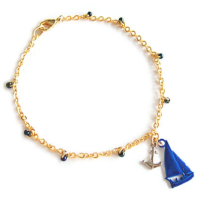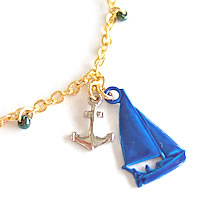 ヨットモチーフのカラフルなパーツを使って作ったブレスレットです。ヨットパーツは、アルミ板の上にガラスの粉を散りばめて焼いた日本でいう七宝焼の様な手法で作られています。フランスでは、「emaille