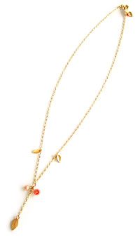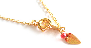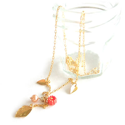 赤いお花と葉っぱの付いたキュートなネックレスです。同デザインのピアスと一緒に身につけるとステキです。