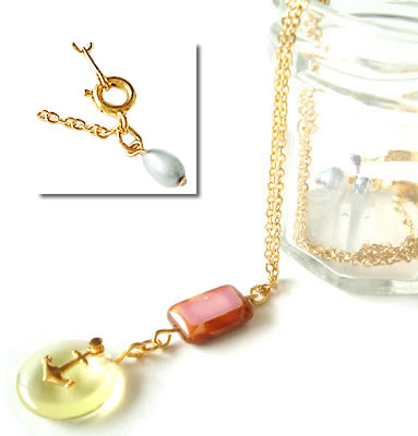 ガラスビーズの上にイカリのパーツがゆれるか夏らしいネックレスです。アクセントに、ピンクのフランスビーズをつけて、つなげてみました。留め具部分にもプチビーズがついています。