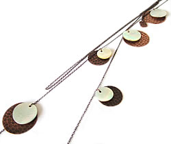 人気セレクトショップ「olga」のシェルネックレスです。留め具の無いネックレスで一本のラインチェーンになっています。ブロンズ色のラウンドプレートに光沢のあるシェルビーズが重なった素敵なデザイン。画像の様に、首に巻きつけたり、端のチェーンを結んでみたり、センターの位置が特に決まっていないので、自分好みにつけれます。オーガンジーのポーチ付なので、プレゼントにもオススメです。
